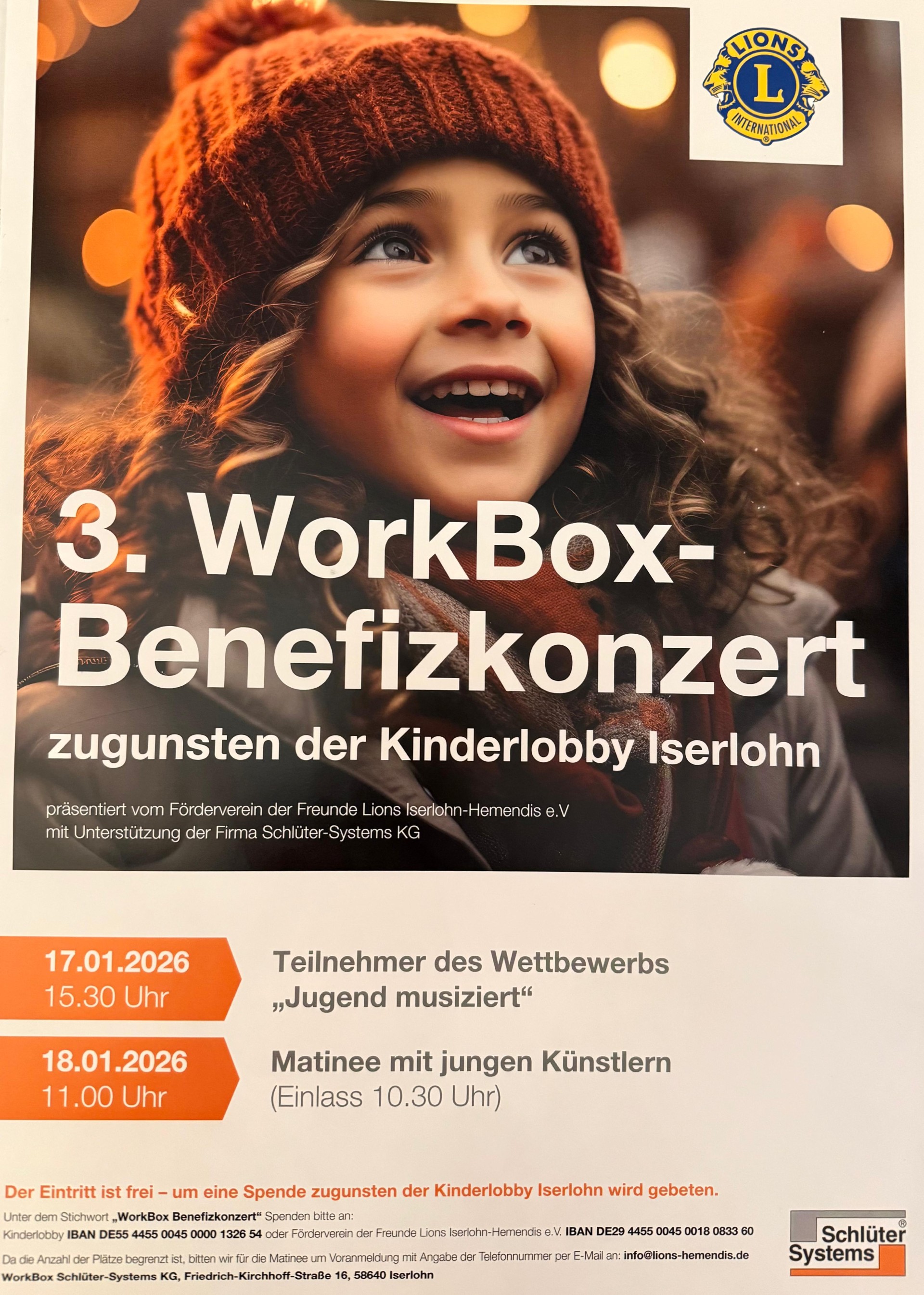 Die Damen des LionsClubs Iserlohn-Hemendis laden Sie zusammen mit der Fa. Schlüter-Systems KG zu zwei besonderen Konzerten am 17. und 18. Januar 2026 in die WorkBox, Friedrich-Kirchhoff-Straße 16, 58640 Iserlohn ein.